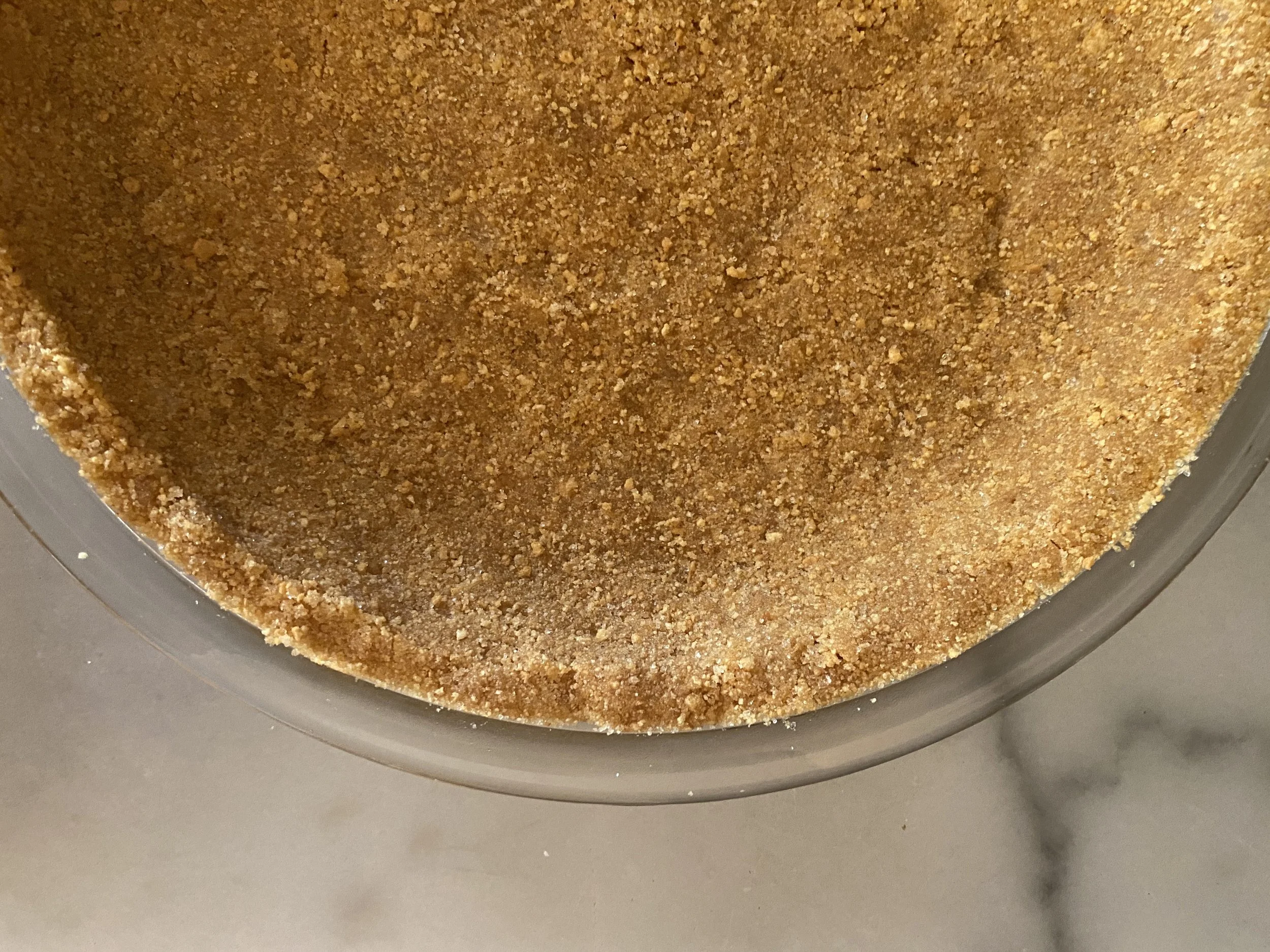 - Mix graham cracker crumbs, sugar and melted butter together in a 9" pie plate until all crumbs are moistened.